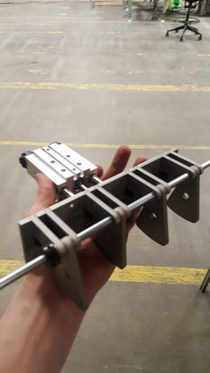 In this part of the assembly line, backpressure from the rest of the cans must be relieved to allow them to be picked up and placed into a tray. To do this, each lane has a paddle which only gets pressed once the lane is completely filled. Then, once all the lanes are pressed back, a light is able to shine through to a sensor. Once activated, a piston presses down on the incoming cans, then another relieves any remaining pressure between the stopped cans and the rest of the lane.